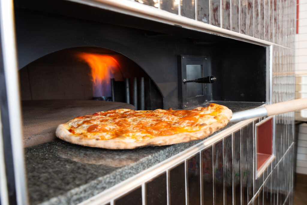 The secret to any good pizza is the crust. And the ticket to a great crust is the oven. Our rotation brick oven bakes each pizza to perfection at 710 degrees in 4 minutes. The stone was harvested from the Italian Dolomites. The oven weighs 3,900 lbs and required the building to be structurally engineered to accommodate it. During peak times, we can fit up to 6 large pizzas in the oven at once.